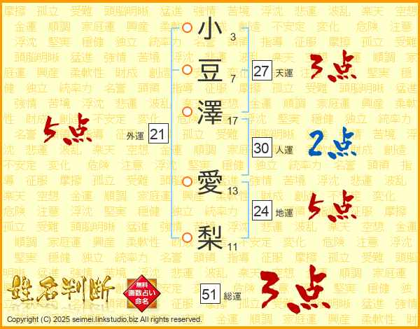 小(3画)豆(7画)澤(17画) 愛(13画)梨(11画)