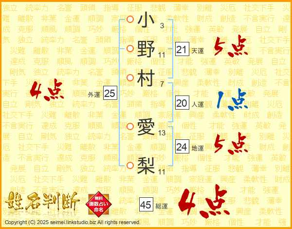 小(3画)野(11画)村(7画) 愛(13画)梨(11画)