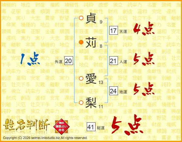 貞(9画)苅(8画) 愛(13画)梨(11画)