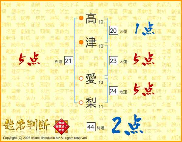 高(10画)津(10画) 愛(13画)梨(11画)