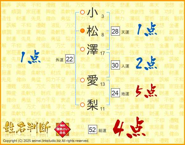 小(3画)松(8画)澤(17画) 愛(13画)梨(11画)