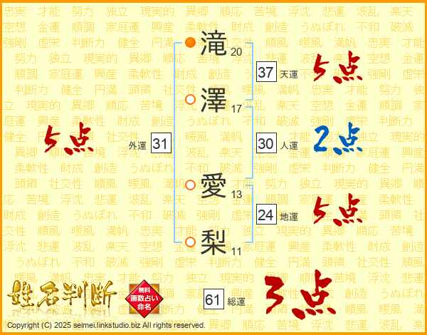滝(20画)澤(17画) 愛(13画)梨(11画)