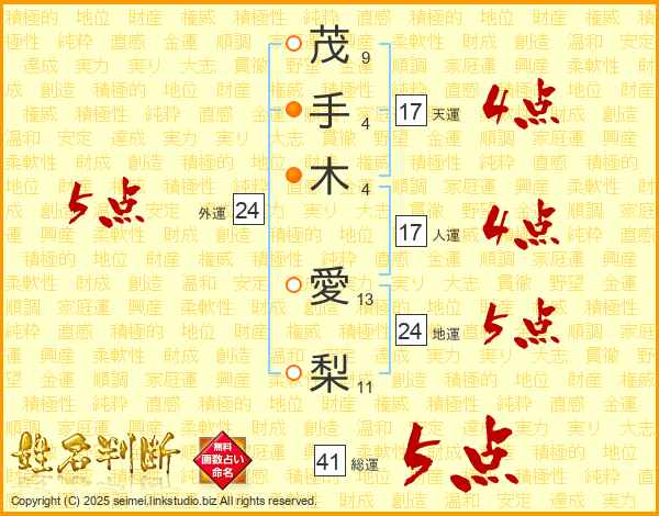茂(9画)手(4画)木(4画) 愛(13画)梨(11画)