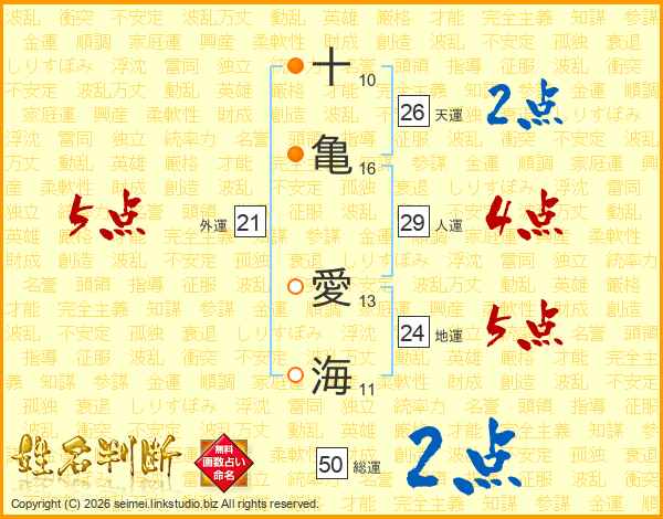 生活面を象徴する運勢です。外部から受ける影響力を表し、結婚運、家庭運や職場、環境への順応性を表します。総運から人運を引いた画数。姓や名が1文字の場合を除く。