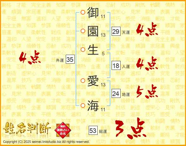 御(11画)園(13画)生(5画) 愛(13画)海(11画)