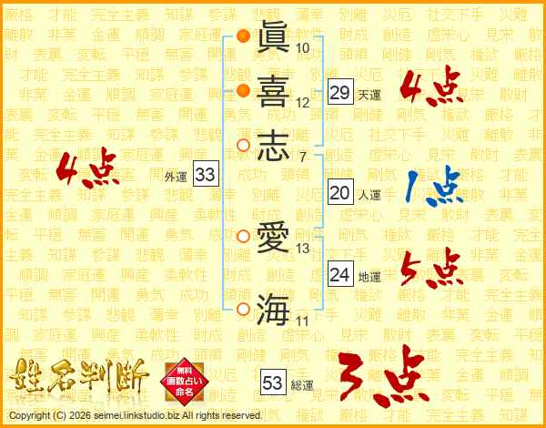 眞(10画)喜(12画)志(7画) 愛(13画)海(11画)