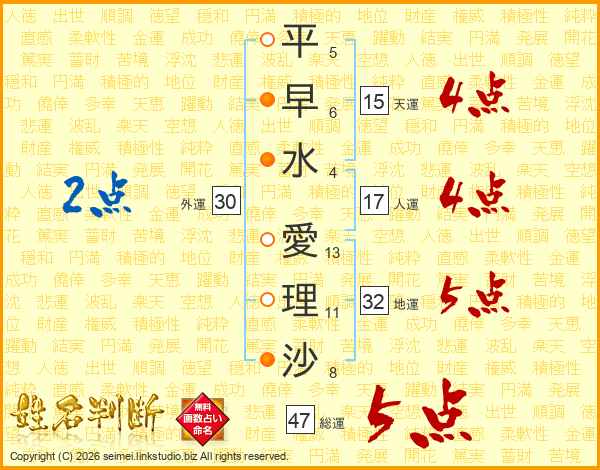 平(5画)早(6画)水(4画) 愛(13画)理(11画)沙(8画)