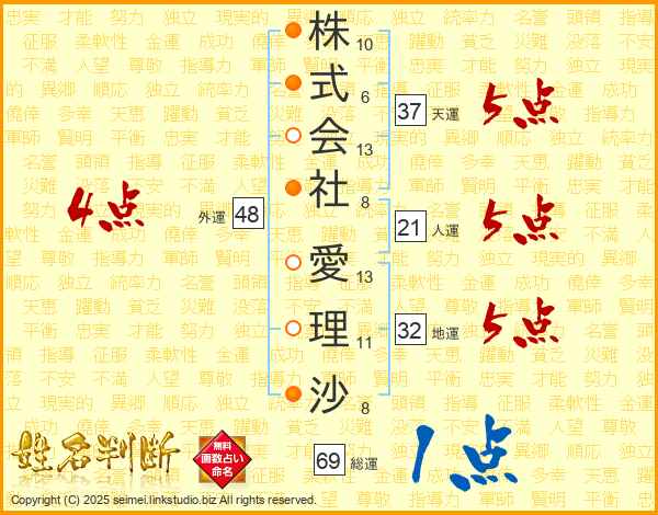 株式会社愛理沙さんの総運は69画の1点!