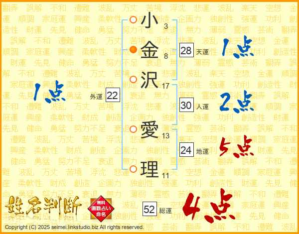 小(3画)金(8画)沢(17画) 愛(13画)理(11画)