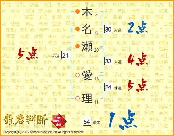 木(4画)名(6画)瀬(20画) 愛(13画)理(11画)