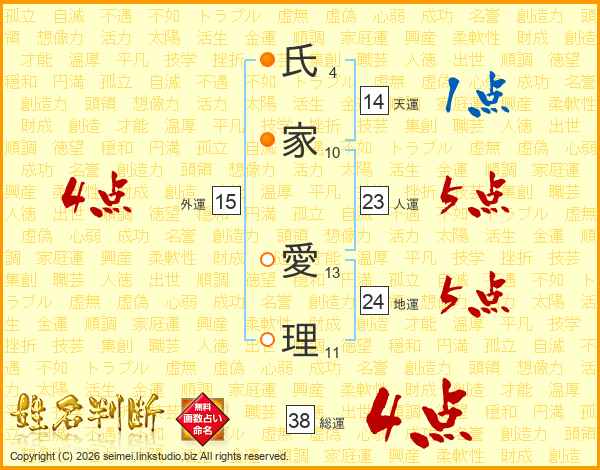 氏(4画)家(10画) 愛(13画)理(11画)