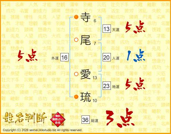 寺(6画)尾(7画) 愛(13画)琉(10画)