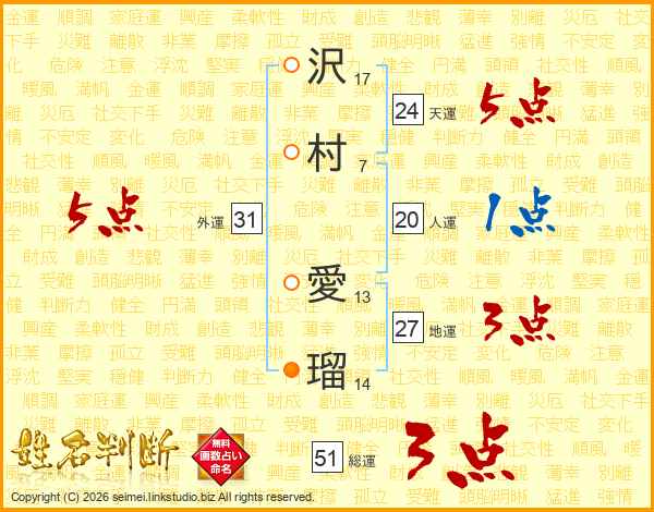 沢(17画)村(7画) 愛(13画)瑠(14画)