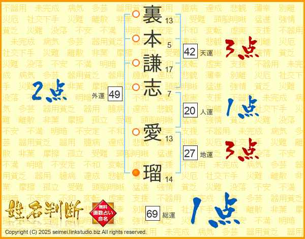 裏(13画)本(5画)謙(17画)志(7画) 愛(13画)瑠(14画)