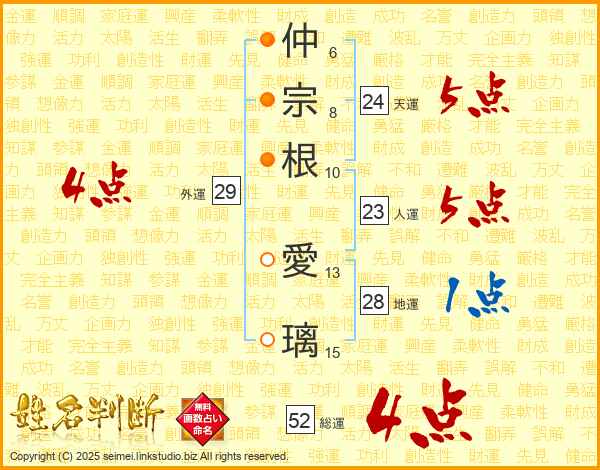 仲(6画)宗(8画)根(10画) 愛(13画)璃(15画)