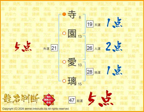 寺(6画)園(13画) 愛(13画)璃(15画)