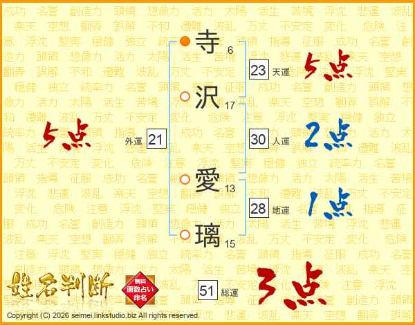 寺(6画)沢(17画) 愛(13画)璃(15画)
