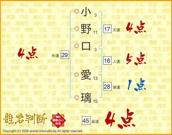 小(3画)野(11画)口(3画) 愛(13画)璃(15画)