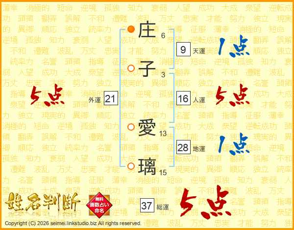 庄(6画)子(3画) 愛(13画)璃(15画)