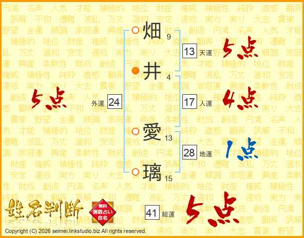 畑(9画)井(4画) 愛(13画)璃(15画)