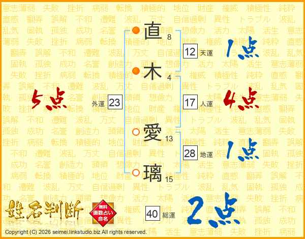 生活面を象徴する運勢です。外部から受ける影響力を表し、結婚運、家庭運や職場、環境への順応性を表します。総運から人運を引いた画数。姓や名が1文字の場合を除く。