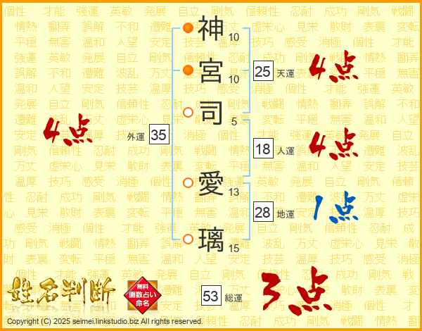 神(10画)宮(10画)司(5画) 愛(13画)璃(15画)