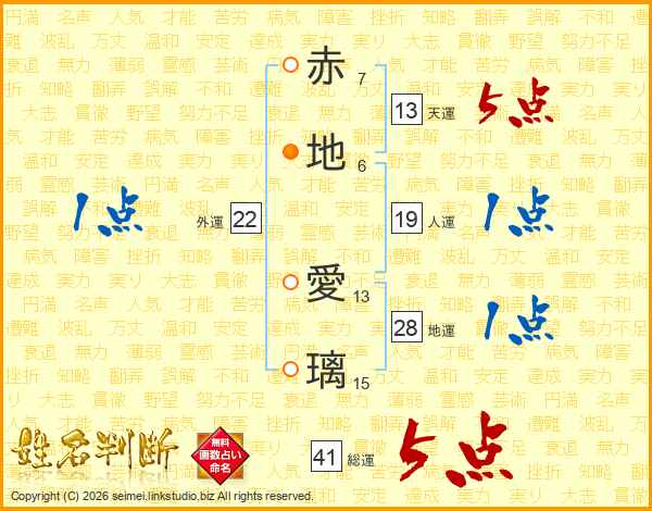 赤(7画)地(6画) 愛(13画)璃(15画)