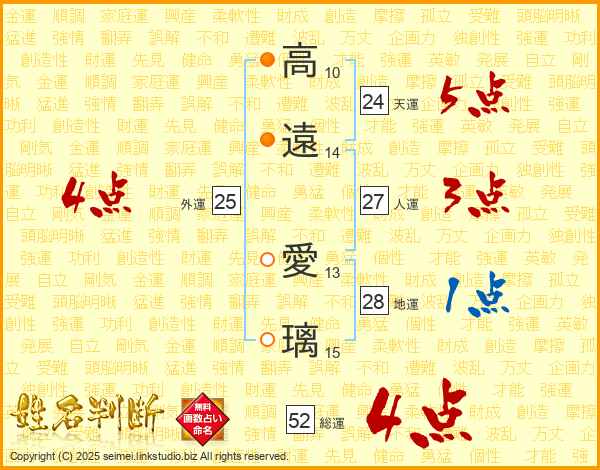高(10画)遠(14画) 愛(13画)璃(15画)