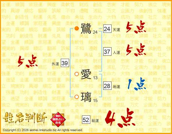 生活面を象徴する運勢です。外部から受ける影響力を表し、結婚運、家庭運や職場、環境への順応性を表します。総運から人運を引いた画数。姓や名が1文字の場合を除く。