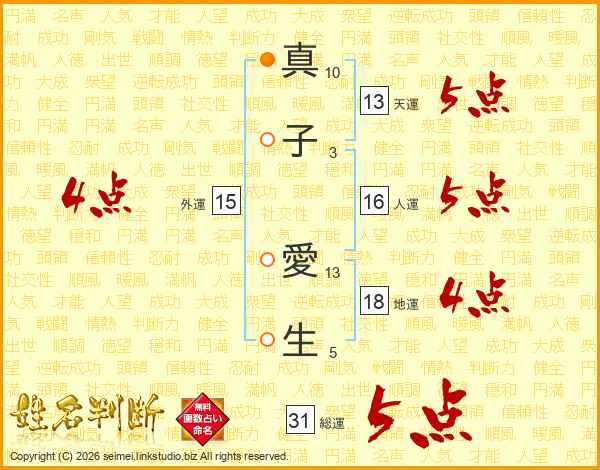 真(10画)子(3画) 愛(13画)生(5画)