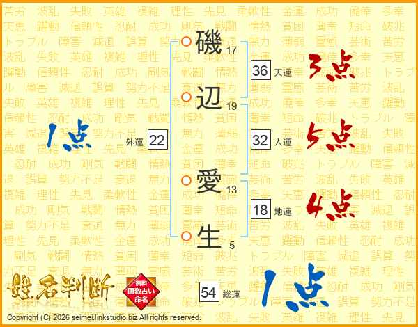 磯(17画)辺(19画) 愛(13画)生(5画)