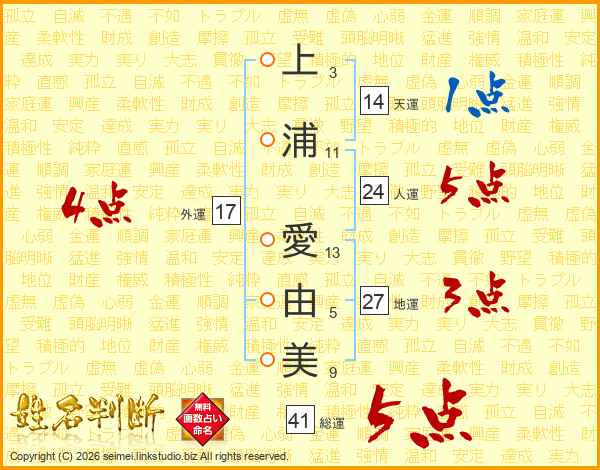 上浦愛由美さんの総運は41画の5点!