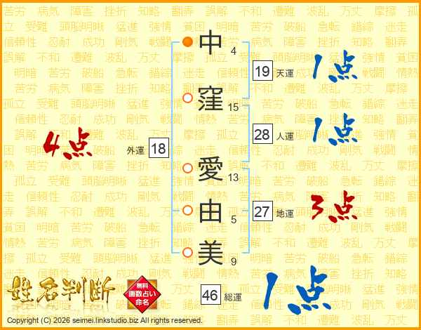 中(4画)窪(15画) 愛(13画)由(5画)美(9画)