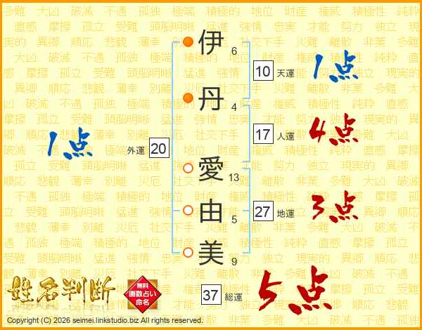 伊(6画)丹(4画) 愛(13画)由(5画)美(9画)