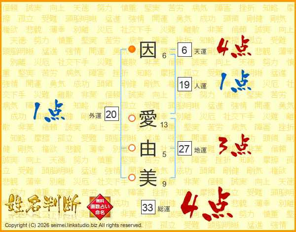 因愛由美さんの総運は33画の4点!