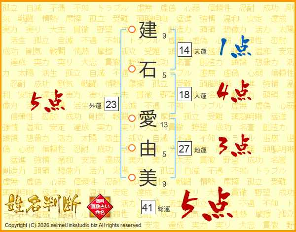 建(9画)石(5画) 愛(13画)由(5画)美(9画)
