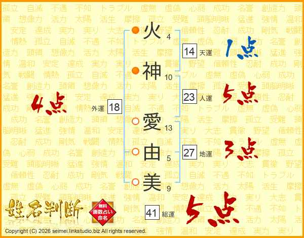 火(4画)神(10画) 愛(13画)由(5画)美(9画)