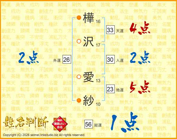 樺(16画)沢(17画) 愛(13画)紗(10画)