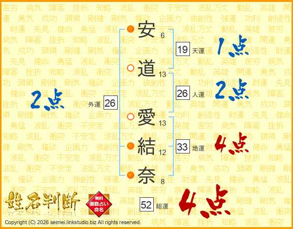 安(6画)道(13画) 愛(13画)結(12画)奈(8画)