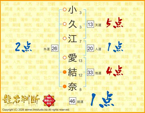 小(3画)久(3画)江(7画) 愛(13画)結(12画)奈(8画)