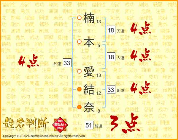楠(13画)本(5画) 愛(13画)結(12画)奈(8画)
