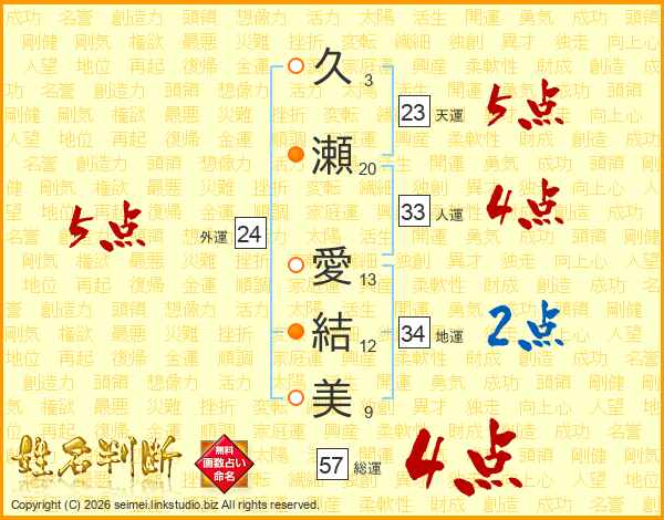 久(3画)瀬(20画) 愛(13画)結(12画)美(9画)