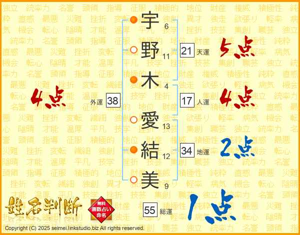 宇(6画)野(11画)木(4画) 愛(13画)結(12画)美(9画)