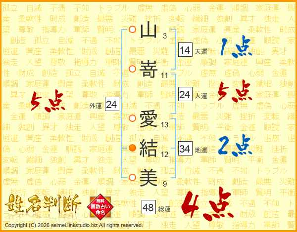 山(3画)嵜(11画) 愛(13画)結(12画)美(9画)