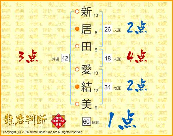 新(13画)居(8画)田(5画) 愛(13画)結(12画)美(9画)