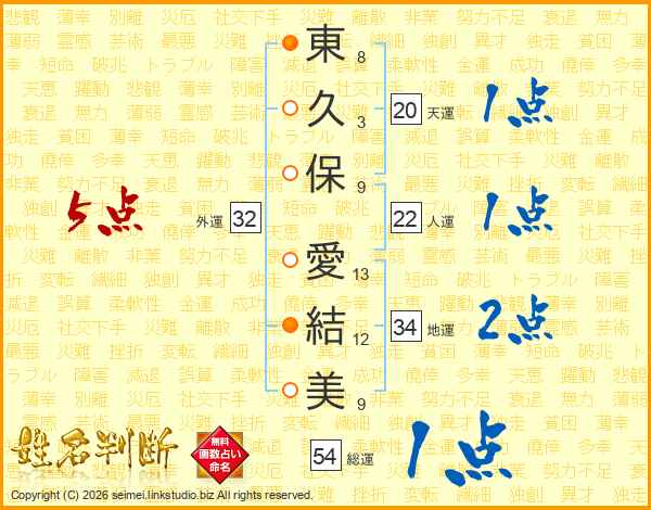 東(8画)久(3画)保(9画) 愛(13画)結(12画)美(9画)