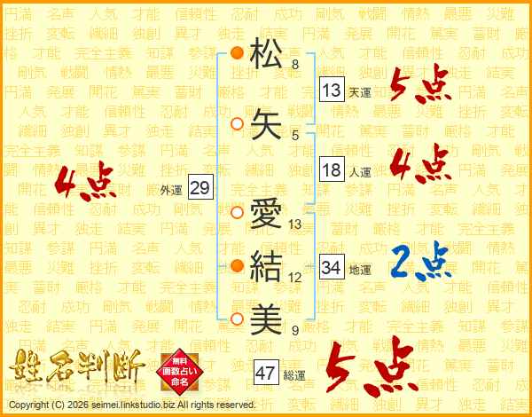 松(8画)矢(5画) 愛(13画)結(12画)美(9画)