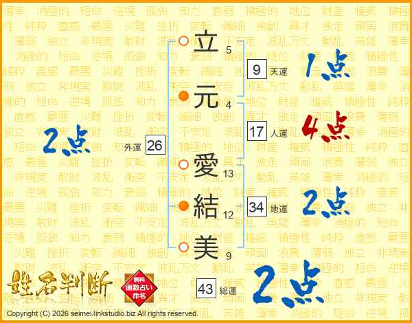 立(5画)元(4画) 愛(13画)結(12画)美(9画)