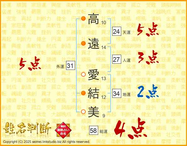 高(10画)遠(14画) 愛(13画)結(12画)美(9画)