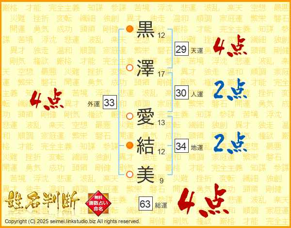 黒(12画)澤(17画) 愛(13画)結(12画)美(9画)